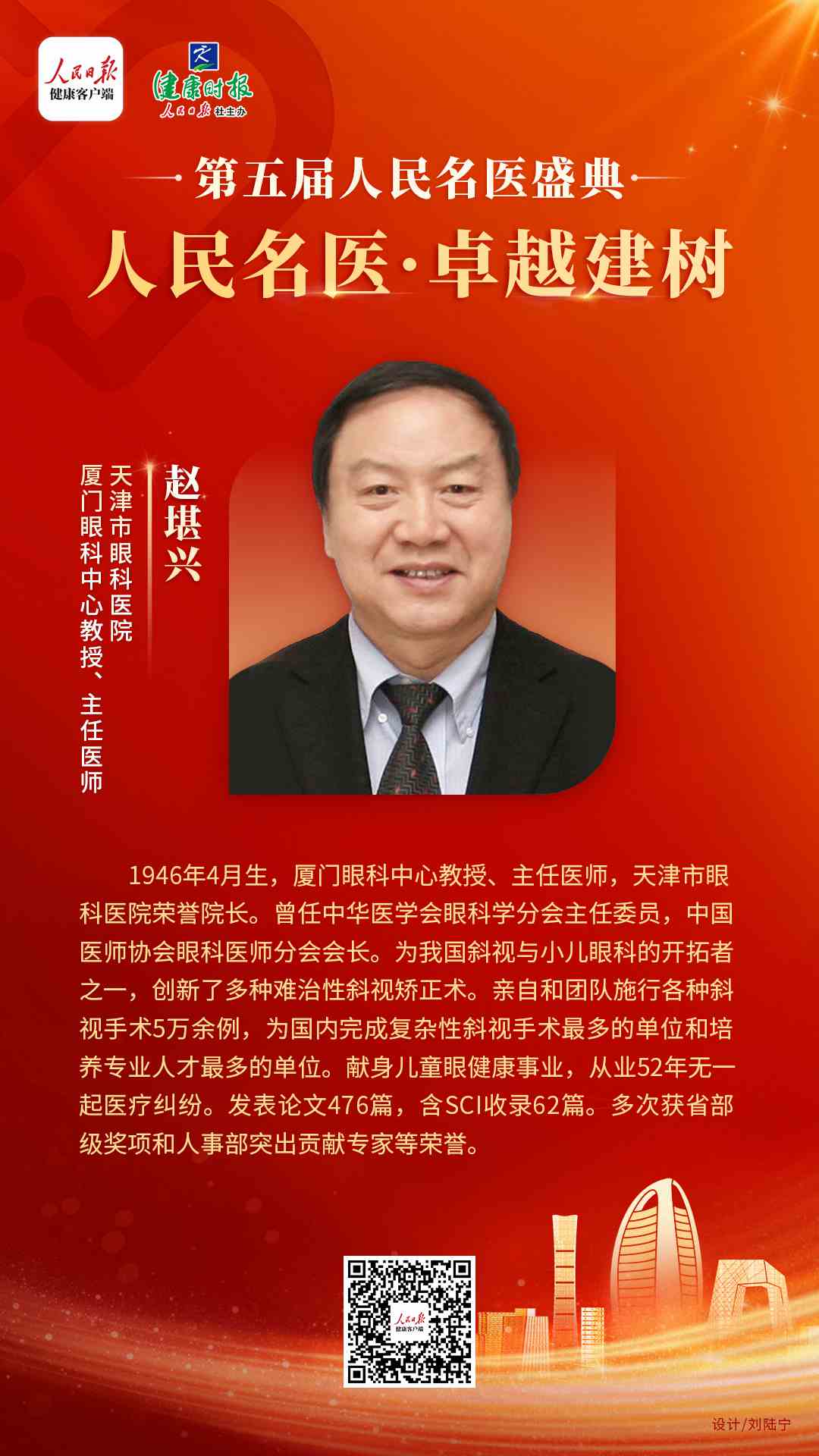 8月16日,由人民日報健康客戶端、健康時報主辦的第五屆人民名醫(yī)盛典于線上舉行,會上發(fā)布了備受業(yè)內(nèi)關(guān)注的人民名醫(yī)系列榜單。其中,廈門眼科中心國際眼科科學(xué)院院士趙堪興教授獲“人民名醫(yī)——卓越建樹”榮譽稱號。