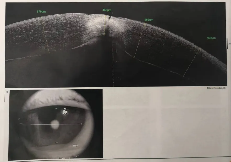 吳護(hù)平主任為小黃安排了詳細(xì)的檢查。經(jīng)過(guò)檢查,我們確認(rèn)了小黃為真菌性角膜潰瘍,在小黃角膜中央偏顳下方角膜上可以看到一個(gè)約2.2mm的類圓形的灰白色浸潤(rùn)病灶,遮蓋了部分瞳孔區(qū),深度可達(dá)4/5角膜厚度,同時(shí)角膜上皮有缺損,基質(zhì)水腫,表面可以看見(jiàn)少量白色分泌物附著。