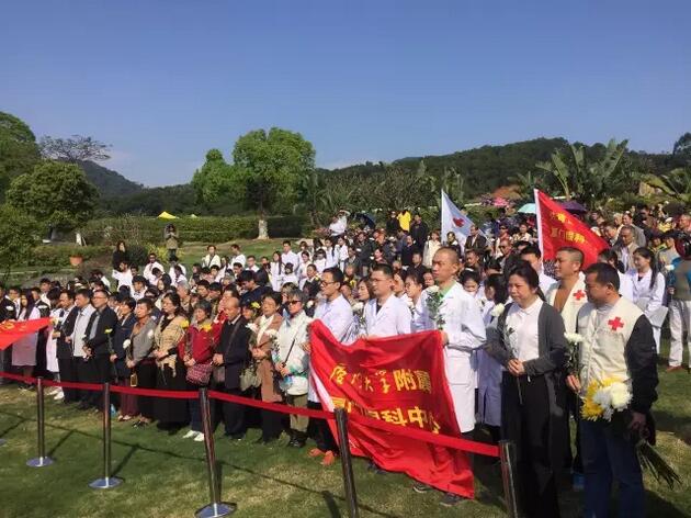 4月1日上午,廈門市紅十字會聯(lián)合廈門大學(xué)附屬廈門眼科中心在海滄文圃山陵園組織的2017年廈門市遺體與器官(組織)捐獻(xiàn)者緬懷紀(jì)念活動順利舉行。捐獻(xiàn)者家屬、捐獻(xiàn)志愿者代表,廈門市紅十字會黨組書記、常務(wù)副會長蘇蘇,廈門市紅十字會副會長兼秘書長俞娟,廈門市衛(wèi)計委醫(yī)政醫(yī)管處處長陳糧,廈門大學(xué)附屬廈門眼科中心黨委書記陳逸恬,以及廈門海滄文圃山陵園開發(fā)有限公司、廈門大學(xué)醫(yī)學(xué)院、廈門醫(yī)學(xué)院、廈門大學(xué)附屬廈門眼科中心以及各區(qū)紅十字會代表共300余人參加了活動。