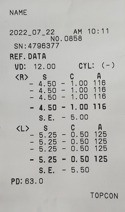右眼450度近視,100度散光,散光軸位116;左眼525度近視,50度散光,散光軸位125;瞳距:63mm