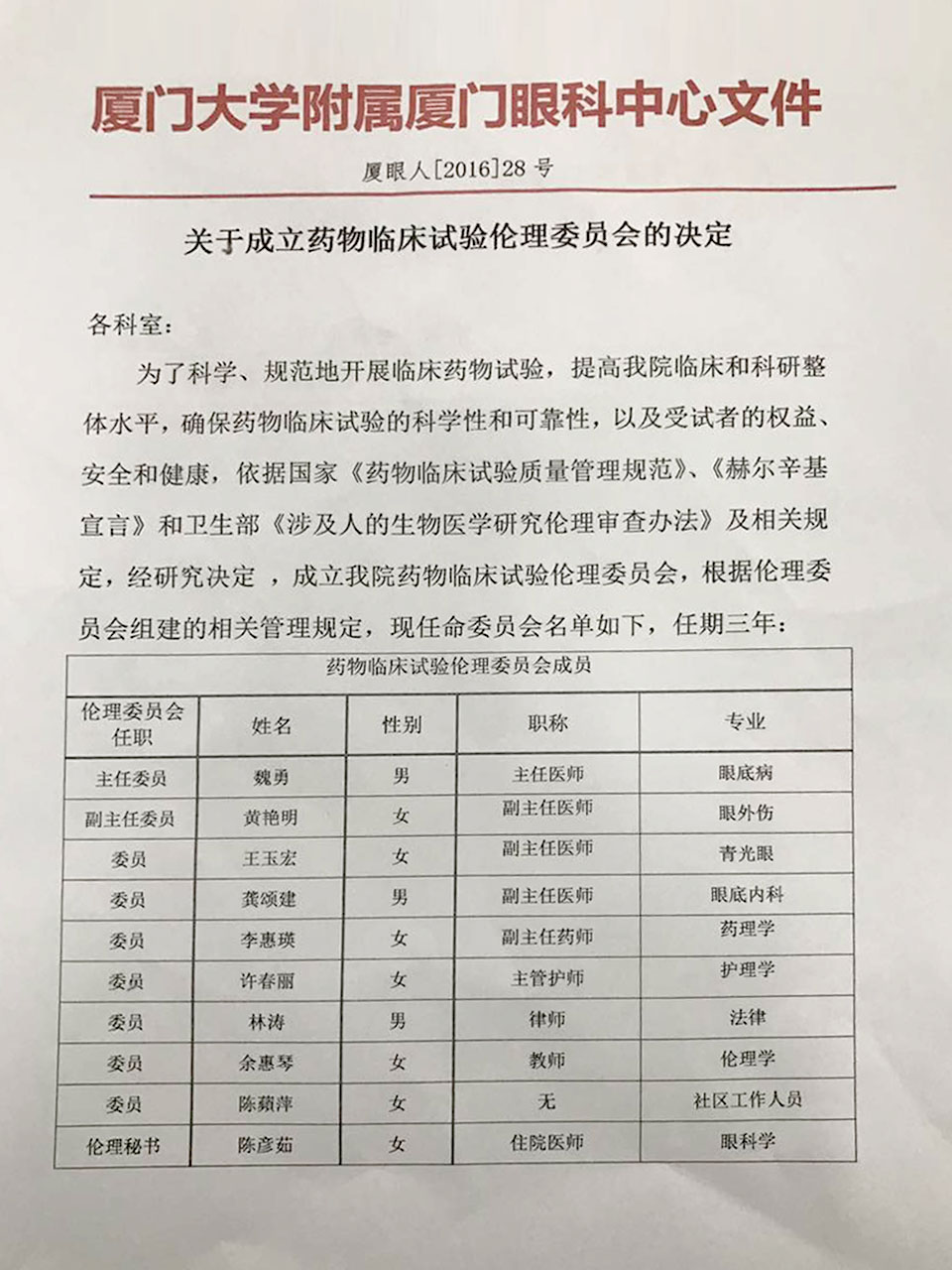 關(guān)于成立藥物臨床試驗(yàn)倫理委員會的決定
